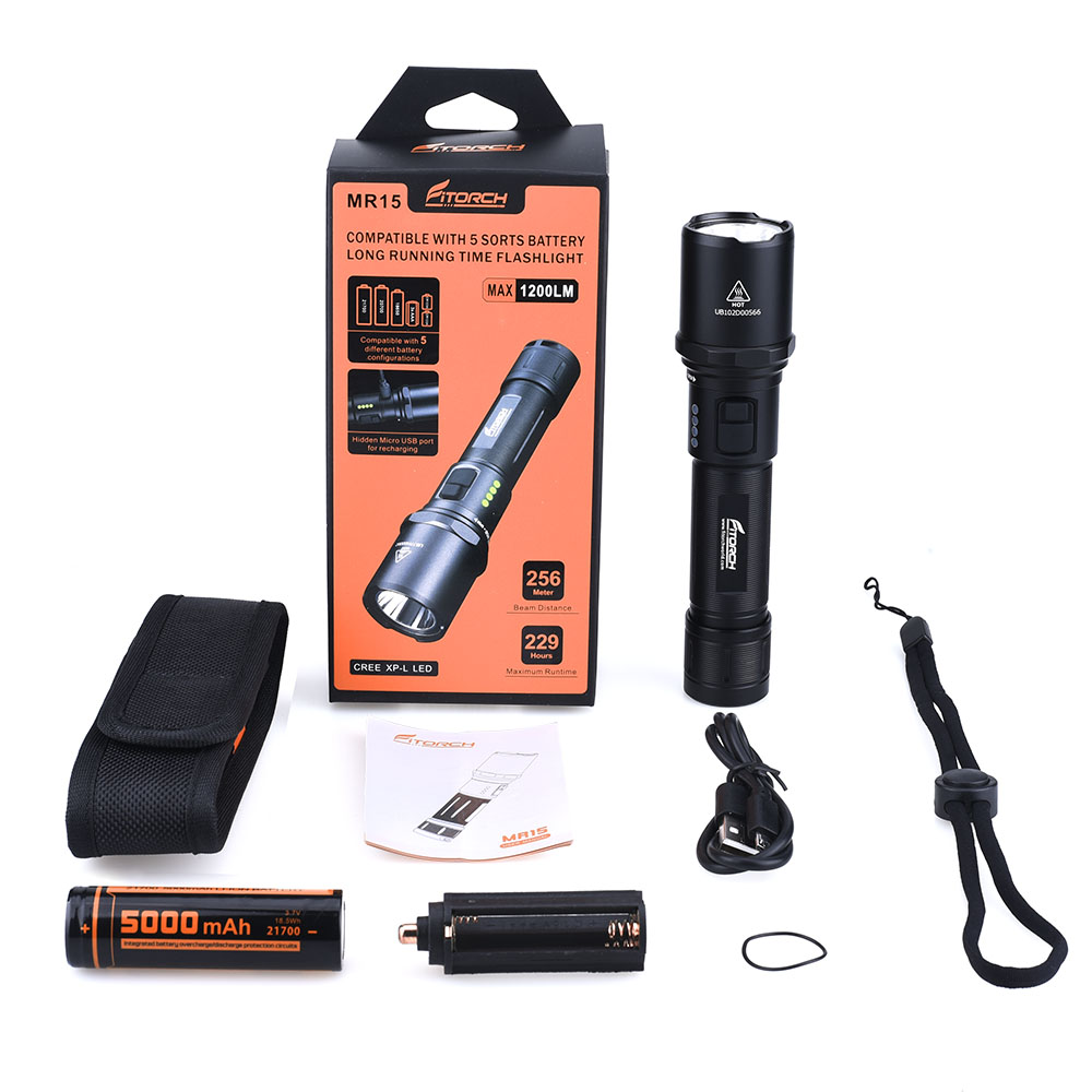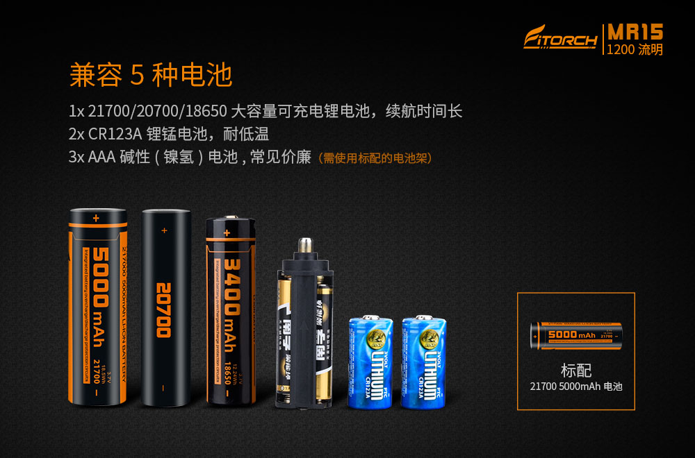 * 兼容1x 21700/1x 20700/1x 18650/3x AAA/2x CR123A電池