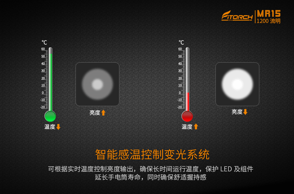 * 智能溫控系統(tǒng),可根據(jù)實時溫度控制亮度輸出